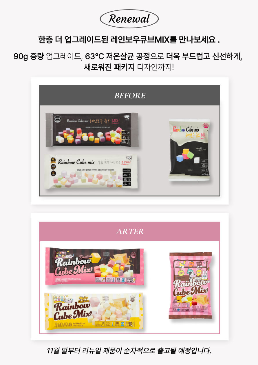 남여노소 누구나 쉽게 즐길수있는 치즈함량이 50%이상되는 과일맛 레인보우큐브MIX!! 아이스크림처럼~ 때론 스프레드치즈처럼~